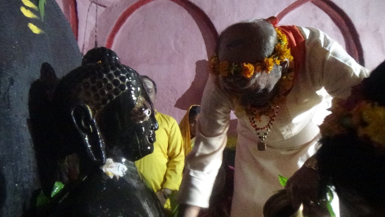 With that in mind, we can understand more about this deity of Kala Bhairava who is being worshipped at Baidyanath Jyotirlinga in Jharkhand. The reality is he is literally a deity of Lord Buddha, not Kala Bhairava. Of this there is no doubt. Sometimes Jain followers will claim he is one of their Tirthankara deities, but from the iconographic details it is clearly Lord Buddha. Jain Tirthankaras do not keep one hand on their knee, whereas statues of Lord Buddha from that time period were often depicted in this pose (called as the Bhumisparsha Mudra), and we can show other examples of this in Jharkhand and Odisha.