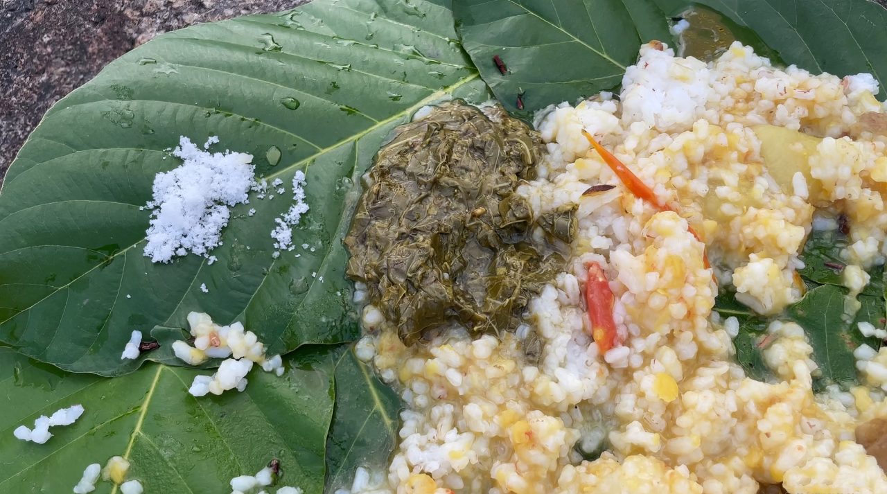 Jangali saaga (forest spinach) collected and prepared by Dayalu Baba while roaming the Salandi river.