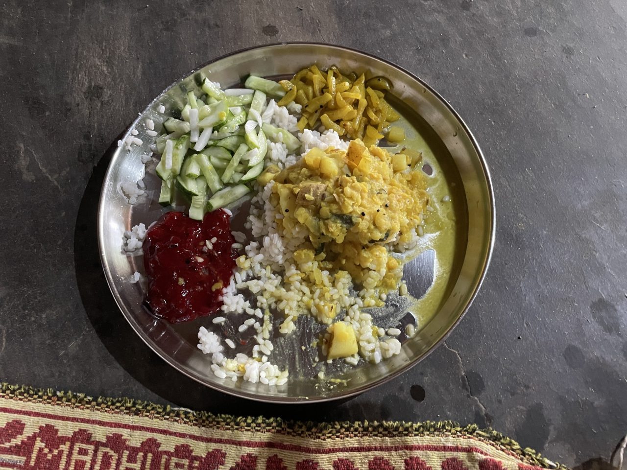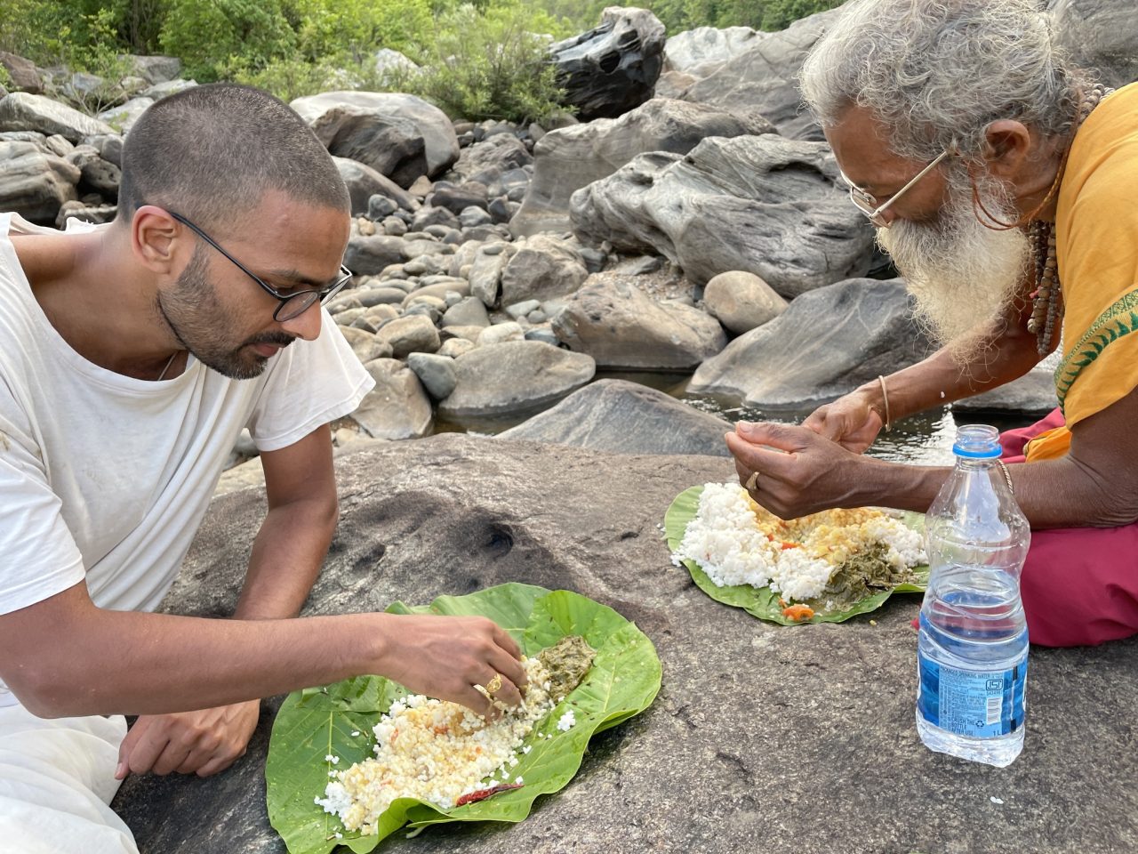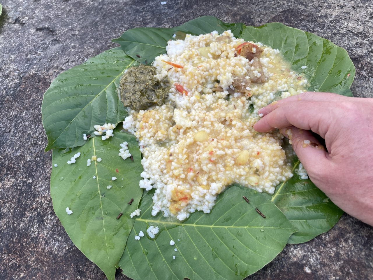 The leaf plate was also made by baba on the spot by collecting leaves and stitching them together with small wood twigs.