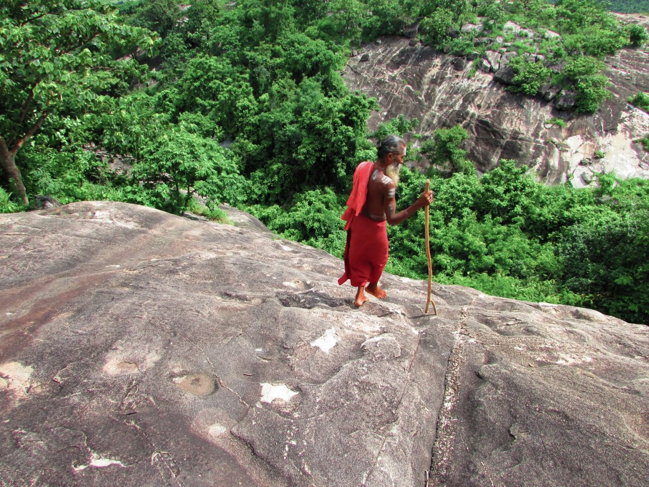 On one of these trips on top of this mountain he pointed to some wild cactus looking plant growing in the cracks between the granite, and told me we can eat this for food and water. He pulled one of the stems off the bunch and then showed me how to sand it against the granite stone to remove the thorns and hard shell, leaving a pulpy center filled with water. Then he told me, “This is the food sadhus rely on when they are staying in remote places like this for sadhana”.